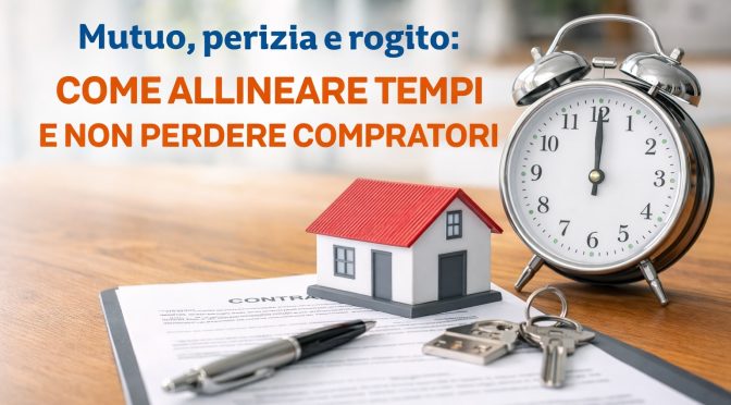 Mutuo, perizia e rogito: come allineare i tempi e non perdere compratori Perché i tempi sono decisivi in una compravendita immobiliare Una delle situazioni più frequenti nelle compravendite immobiliari è questa: il compratore trova la casa giusta, firma una proposta o un preliminare, richiede il mutuo… e da quel momento iniziano ritardi, telefonate, documenti mancanti … Continue reading Mutuo, perizia e rogito: come evitare ritardi e non perdere compratori